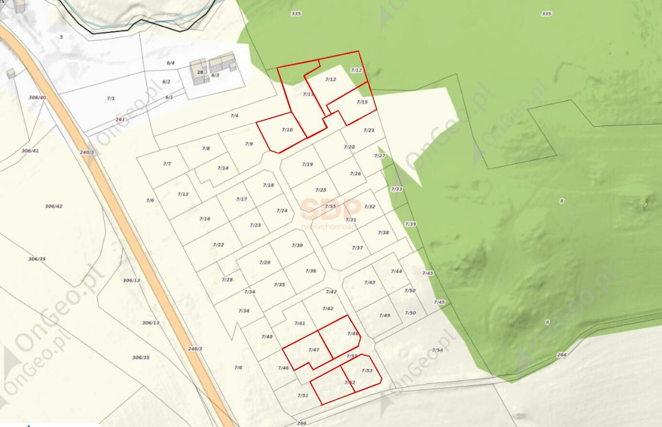 Działki na sprzedaż zaznaczone kolorem czerwonym.